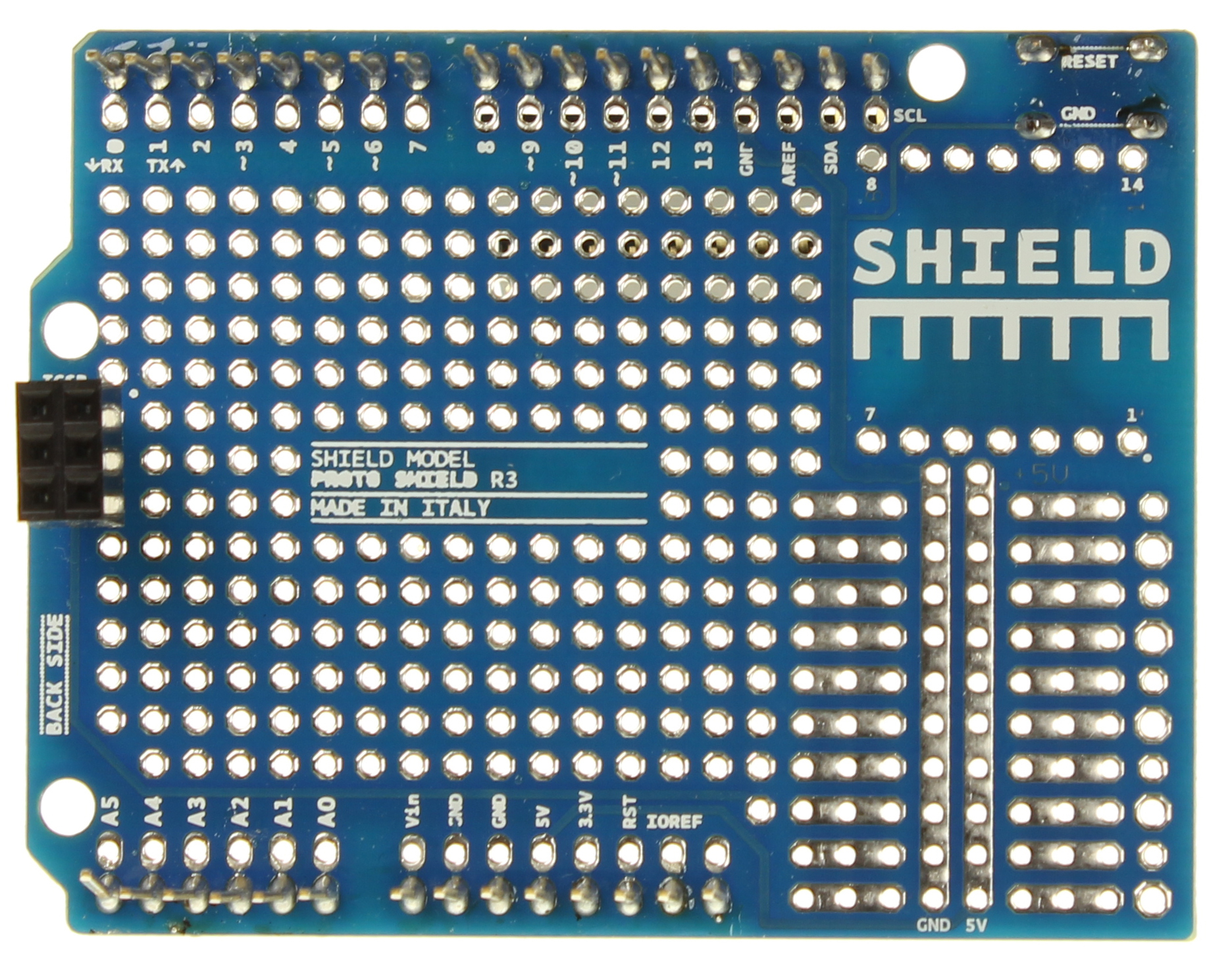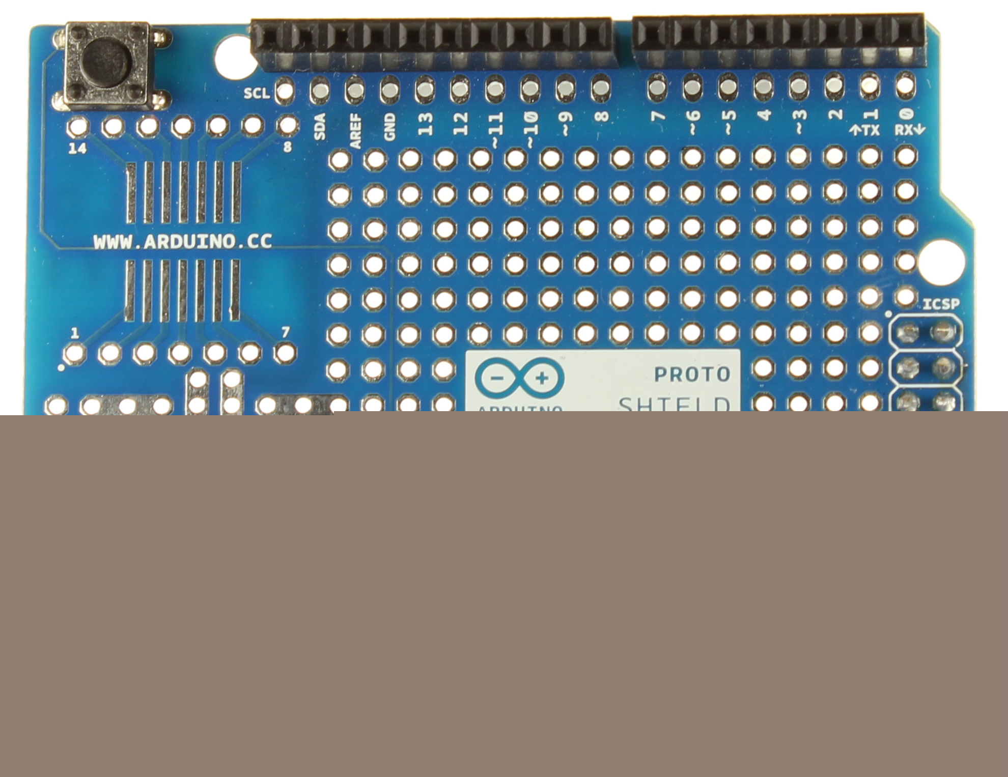 The Arduino Prototyping Shield makes it easy for you to design custom circuits. You can solder parts to the prototyping area to create your project, or use it with a small solderless breadboard (not included) to quickly test circuit ideas without having to solder. It's got extra connections for all of the Arduino I/O pins, and it's got space to mount through-hole and surface mount integrated circuits. It's a convenient way to make your custom circuit and Arduino into a single module.