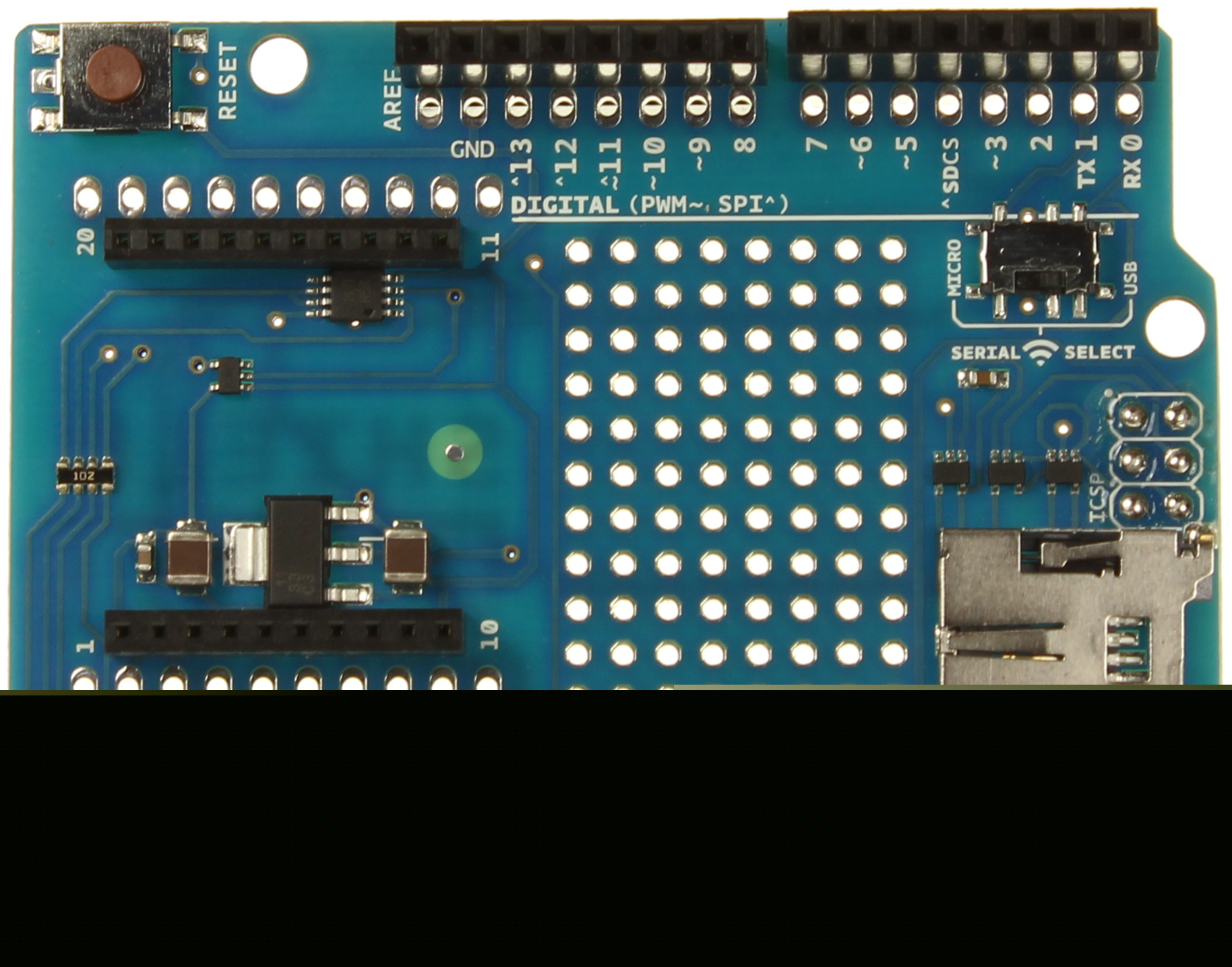 Included on board is a SD card slot. When using the SD Library to access the card, Pin 4 is CS and cannot be used otherwise. SPI also relies on pins 11, 12, and 13 for communication.