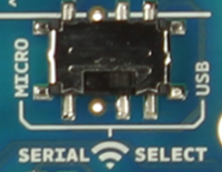 An on-board switch allows the wireless module to communicate with the USB-to-serial converter or with the microntroller.
