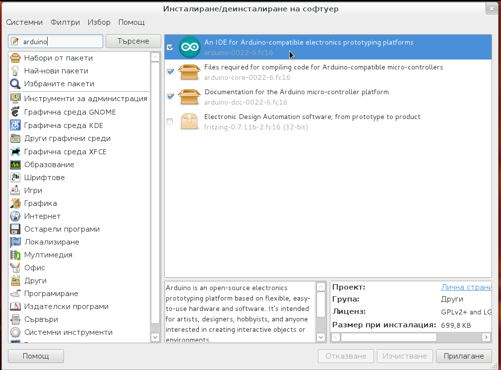 4. В полето с резултати ще се появи пакета "An IDE for Arduino-..." и още няколко пакета. Маркирайте отметката пред IDE-то и цъкнете върху бутона "Прилагане".