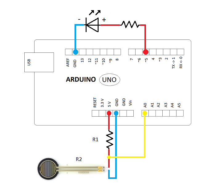 За да се отчете оказания натиск, сензорът се свързва в схема „делител на напрежение“, която може да се захрани с 5V от Arduino. Изходното напрежение от схемата се подава към аналогов вход и се отчита с микроконотролер, по зададена програма. В примера ще използваме и зелен дифузен светодиод за визуализиране на натиска.