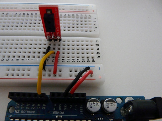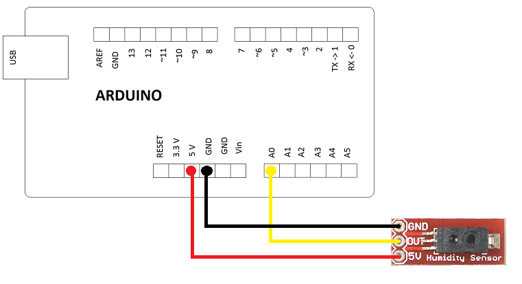 Сензорът се свързва към Arduino, като пиновете 5V и GND са към 5V и GND на платката, а OUT е към входа A0.