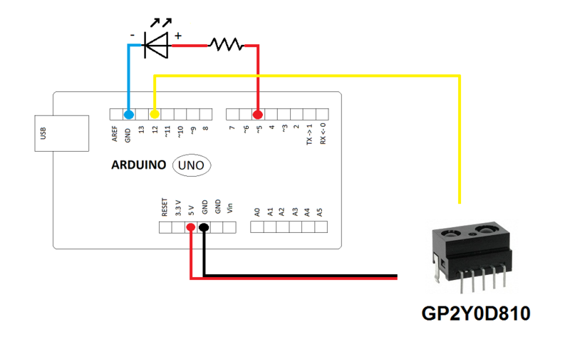 GP2Y0D810 е инфрачервен сензор с обхват до 10см. Необходимо му е напрежение от 2.7 до 6.2V и спокойно може да се захрани от Arduino. Връща сигнал с ниво HIGH или LOW, който се подава към някой от цифровите входове на микроконтролера.