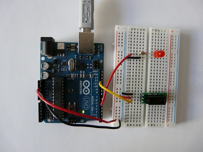 Когато засече обект в обхвата си премивава в ниво LOW и за да сигнализираме това ще използваме светодиод. Микроконтролера събира информация за броя на обектите, преминавали в обхвата на сензора и връща броя им в Serial Monitor-а.