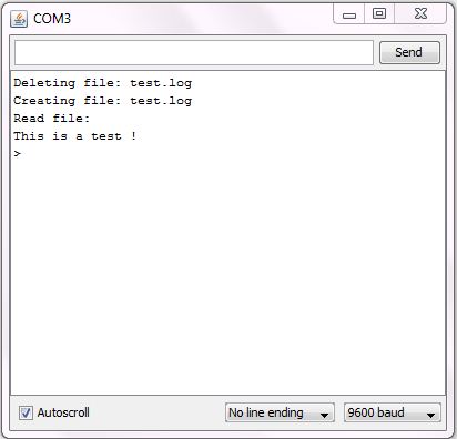 Програмата създава файл "test.log" на microSD карата и го изтрива преди това, ако е имало такъв на нея. Във файла се записва "This is a test !" и после се прочита от микроконтролера на Arduino. В Serial Monitor се извежда информация за хода на програмата.
