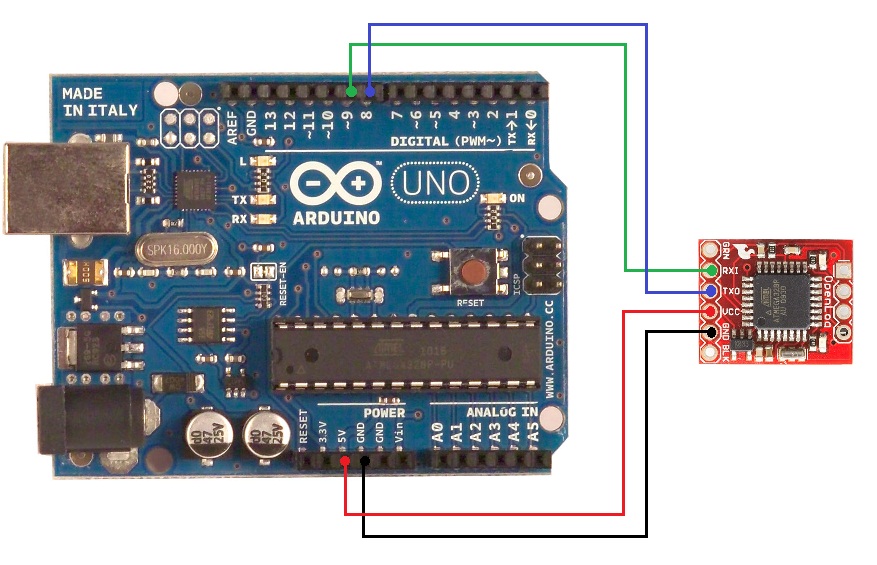 VCC -> 5V GND -> GND RXI -> pin9 TXO -> pin8