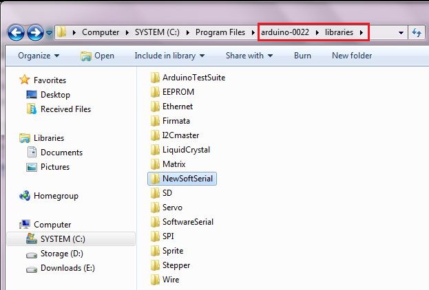 В дадения по-долу пример е използвана библиотека за софтуерна серийна комуникация. Библиотеката може да изтеглите от тук. Разархивира се в libraries от "arduino-00xx" директорията.