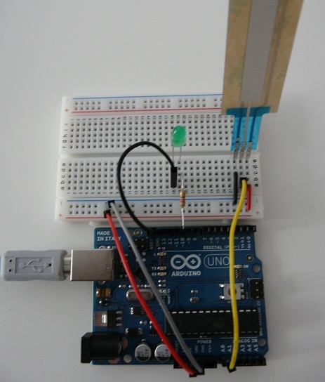 За да се разбере, къде точно е натиснат, сензорът се свързва към захранващо напрежение и се отчита измененито му чрез аналогов вход на микроконтролер. В примера използваме сведодиод за да визуализираме това изменение.