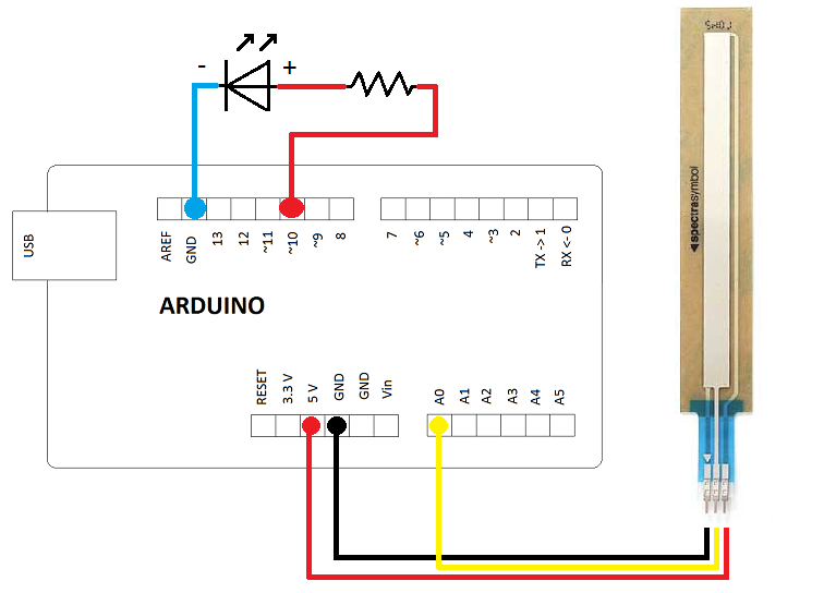 Крайните два пина на сензора се свързват към 5V напрежение от Arduino и към маса, а средният пин е към входа A0. Ако масата се подаде на пина, отбелязан със стрелка, напрежението на средния пин ще се увеличава с отиване към края на мембраната.
