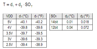 Изчисляването на температура става по следната формула, в която SОт е стойността, прочетена от сензора, а d1 и d2 са коефиценти от даташийта на продукта.