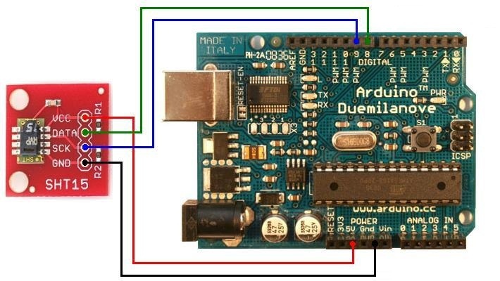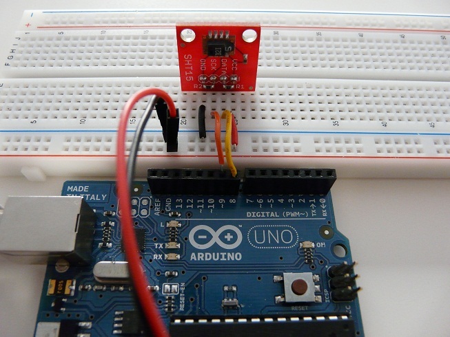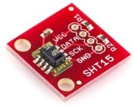 SHT15 е сензор за измерване на температура и влажност. Може да се намери запоен върху брейкаут борд, който го прави лесен за използване с бредборд. Комуникацията със сензора се осъщестява по две линии, но I2C протокола не може да се използва т.е. наличните Arduino библиотеки за комуникация не вършат работа.