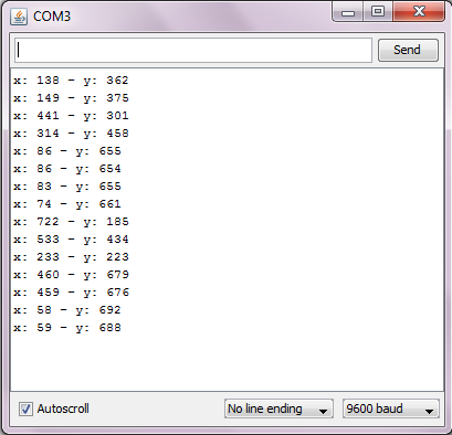 Даденият по-долу код получава X и Y координатите на точката, в която е натиснат панела и ги извежда в Serial Monitor. Координатите на точката в най-горния ляв ъгъл е 0,0 а на точката в най-долния десен ъгъл е 800,770.