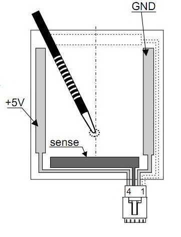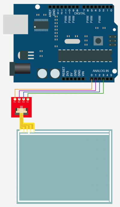 При допир панелът променя съпротивлението си за всяка ос. Ако се захрани с 5V на два от пиновете, при допир ще се промени и изходното напрежение за съответната ос. X и Y координатите на точката, в която е натиснат се получават чрез свързване на панела по две различни схеми.