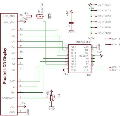 I just bought an I2C module for my LCD. The schematics (from a Hungarian guy who makes it) are here: http://avr.tavir.hu/images/contents/29a.jpg