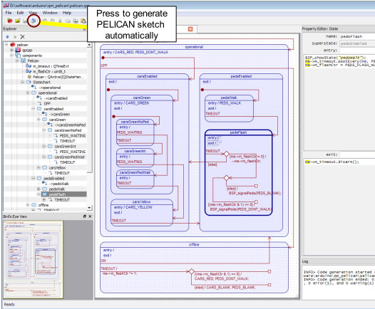 After you download and install QM, you open the provided model (located in <qp_arduino.zip>/examples/qp/qm_pelican/pelican.qm) and press the “Generate Code” button (see picture above). QM will then generate the complete Arduino sketch that you open in the Arduino IDE as any other sketch.