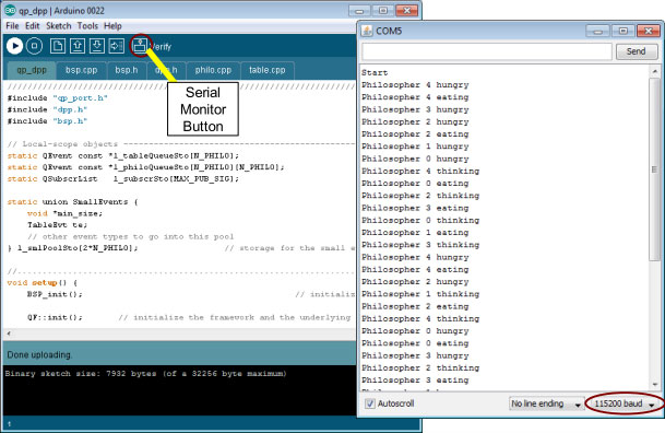 You select the example from the Arduino IDE menu Examples | qp | qp_dpp and press the Upload button. After the upload completes, your Arduino starts executing the example. You should see the User LED start to glow with low intensity (not full on). The User LED is rapidly turned on and off in the Arduino idle loop, which appears as a constant glow to a human eye. To see the actual output from the DPP example, you need to open the the Arduino Serial Monitor by pressing the Serial Monitor button or by selecting the menu Tools|Serial Monitor in the Arduino IDE. After the Serial Monitor opens up, please make sure that it is configured for 115200 baud rate. The Serial Monitor should start displaying the status of the Dining Philosophers.