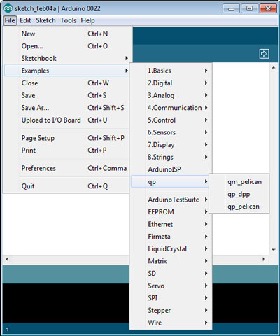 Running the QP examples on the Arduino board is very easy. As shown in screen shot below, the QP examples are integrated with the other Arduino examples in the Arduino IDE, so you just choose one of the QP examples (qp_dpp, qp_pelican, or qm_pelican).