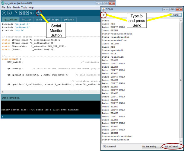 The PELICAN crossing example requires you to inject events to the application by sending key strokes via the Serial Monitor: