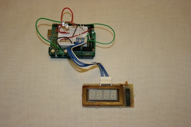 The display I chose is a very cheap ($4 USD) multi-7-segment display called the HC4LED. You could also make this project with a serial or parallel LCD module, but since I (mostly) only need to display 3- and 4-digit numbers, this suits just fine. I wrote a library for the HC4LED that anyone is welcome to play with.
