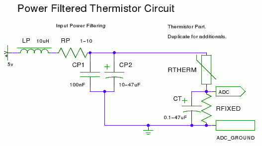 The thermistor block can be duplicated for multiple thermistors. RTHERM is the thermistor. RFIXED corresponds to ResistanceFixed in the code and is calculated based on RTHERM and the desired range. CT is a stabilizing capacitor that will help remove jitter. Thermistors aren't very fast by nature, so even at upper values, the readings will still be reasonably fast.
