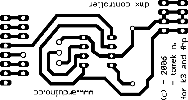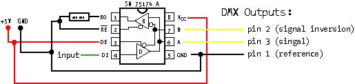 The DMX-shield is an add-on (or "shield") for the Arduino. It is an easy way to use the Arduino as a DMX-Master device (transmitter), just by adding the DMX-shield on the top of the Arduino. This shield is a simple circuit based around a driver chip (MAX-485 or SN 75176). The Driver Block Outputs the 3 Pins are needed for sending DMX (DMX-Pin1 -> Reference (GND); DMX-Pin2 -> Signal inversion (cold); DMX-Pin3 -> Signal (hot)). Furthermore is the Driver Block taking care of changing the Arduino signal Voltage (0V / 5V,) into the DMX signal Voltage (-2,5V / +2,5V, according to RS485). Resistor is 100 Ohm.