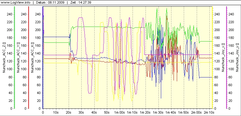Anschließend startet man LogView und klickt aus dem Menü "Gerät" den Punkt "Gerät und Port wählen" an. Im darauf erscheinenden "Gerätedialog" wählt man das Gerät ganz unten (OpenFormat\Arduino-Nunchuck-5Achsen). Bei Port ist der Com-Port des angeschlossenen Arduino-Boards zu wählen. Mit Klick auf "Schließen" wird der Dialog geschlossen und alle notwendigen Einstellungen sind vorgenommen. Jetzt braucht es nur noch ein Klick auf "Aufzeichnung starten" und die Daten erscheinen:
