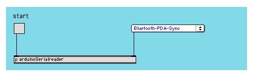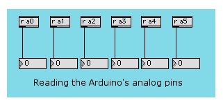 The (new!*) pull-down menu shown above selects the serial port.Once this above patcher is started, you can receive an Arduino pin value by simply making a named receive object. Here's to to read the Arduino's analog pins: