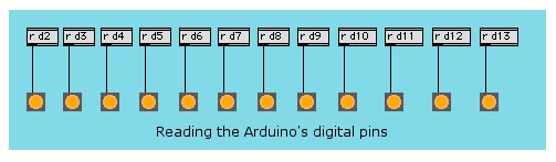 Arduino2Max is a Max patch with accompanying Arduino code that allows you to read the Arduino's 12 digital and 6 analog pins in Max/MSP. To use it, first program the Arduino with the code included in the Arduino2Max zip archive (link below).