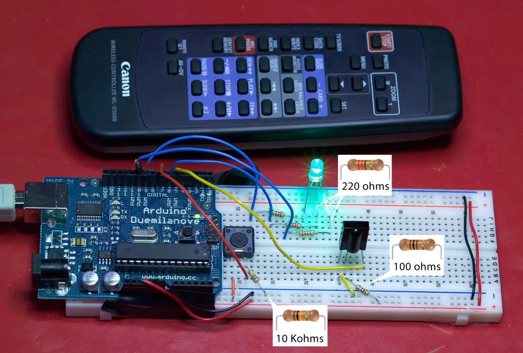 N.B.2. il bottone sulla breadboard non serve a nulla ;) il codice é fatto per ricevere e rimandare un segnale IR. Questo esempio non implementa la seconda funzione. Più elementi su questo argomento in seguito.