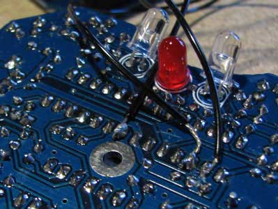 You need to solder a couple of extra wires onto the Asuro to program it. The wires soldered to the adjacent pins go to the RX and TX on the Arduino board (pins 0 and 1). The other wire goes to ground on the Arduino board.