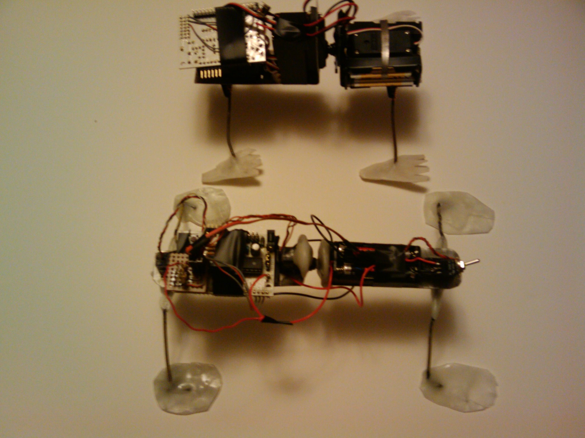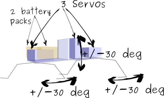 The chassis is very simple. Two servos are oriented so the spindle is pointing down. The remaining servo connects the front half to the back half and provides the ability to twist the waist of the robot. Figure 4 shows a rough picture of the layout of the servos, batteries, and legs.
