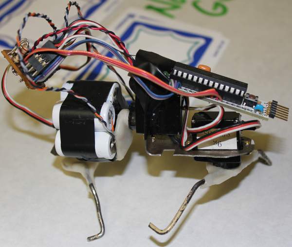 Figure 3The software is relatively simple for this chassis as well. Basically the front and back servos move exactly opposite of each other. So when the back-left foot is forward the front-left foot is backward. The waist simply moves 1/2 way through the time that the back and front servos are in position. Said another you move the front an back to an extreme position (opposite of each other) and then move the waist to the other extreme. Interestingly this simple Front/Back extreme then Waist extreme then other Front/Back extreme then other Waist extreme is all there is to forward (and played in reverse) backward motion. Turning left and right I thought might be trickier but it was simple also. You simply change one limit in the waist. So to turn right do not go to the extreme on the right twist in the waist only go to center. Left is simply going to center not to the extreme on the left twist in the waist. The front and back servos cycle the same in forward, backward, left or right motion.