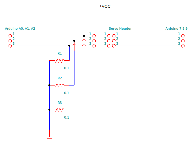 Optionally I have been experimenting with a current sensing circuit added to the ground leg of the servos. Figure 3 is the simple resistive circuit that is used. I have experimented with 2ohm resistors but I plan on switching 0.1ohm when they arrive. These three resistors are tied to analog lines so how much current the servo is drawing can be calculated by the voltage divided by .1 (or 2 ohm). But really I only care that the analog reading is proportional to the torque the servo is exerting.