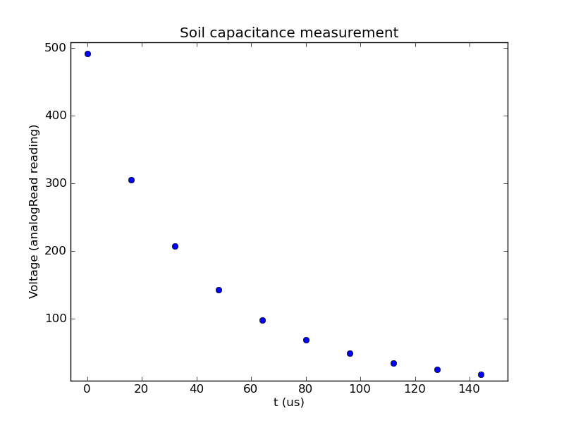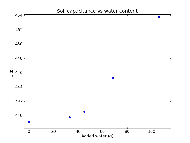 This was originally written to measure soil moisture in flower pots. Below is a test measurement of a soil filled glass jar approx. 10cm in diameter and height. Tinfoil wrapped around the jar was connected to a ground pin. Analog pin was connected to an insulated metal bolt which was inserted in the soil in the middle of the jar. Gradually adding water shows that the moisture content is readable from the capacitance.