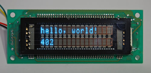 Note from the author: This module isn't as awesome as many other VFDs. It has visible flicker which is even worse when sending data to the display. Also, the clocked serial interface may not be reliable: if it gets out of sync garbage will display until reset. The surplus example I found had been heavily used (medical equipment) and showed considerable burn-in. Given all of this, I got lazy on the documentation. However the library is simple and the samples included in the library and the module datasheet linked to below have all needed information.