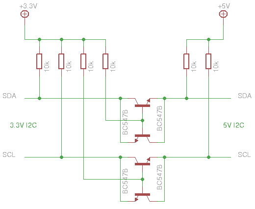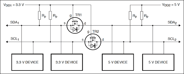 This creates two groups on the I2C-bus, one group with the 5V and one group with a lower voltage. Once the level shifter is implemented, any combination of 3.3V and 5V components can be made and all within the I2C specifications.