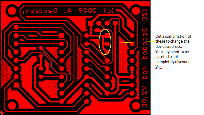 Also note that I've tied the address lines of the 8574 to Vcc. This locks the 3 bit address of the device to be 0x7. If you want to change this for any reason, just cut the tracks on the circuit board to leave those address lines floating.