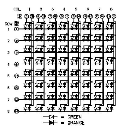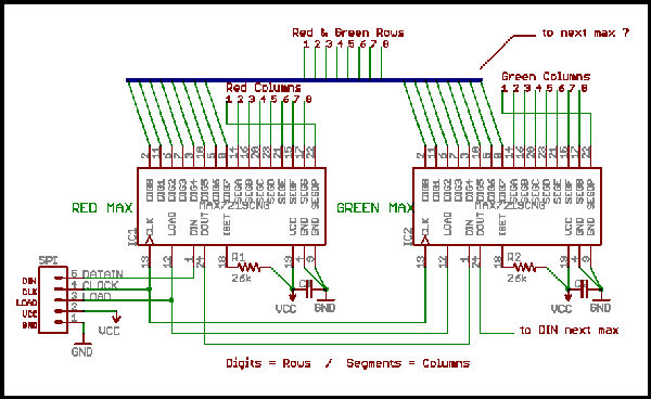 The following diagram shows how a common cathode RG matrix is wired. Note that the cathodes in each row are common for both colors. Since each MAX will be dedicated to driving one color, this means that the digit lines (rows) on the chips will also be connected together.