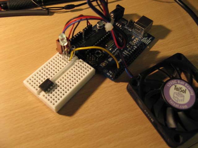 The hall effect sensor pin goes to pin 2, or interrupt 0. The LED and 10k resistor needed to be there for this to work. If your fan takes a lot of current, you might need to use an external power source.