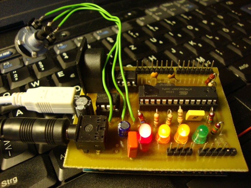 The shield contains a SID-emulator, programmed on an ATMEGA168 chip, some electronic components to use it, a small amplifier and mini-jack out.