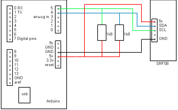 Below is the diagram for setting up the SRF08 sensor for a typical Arduino. The only additional circuitry necessary are two 1.8kOhm pullup resistors as seen below.