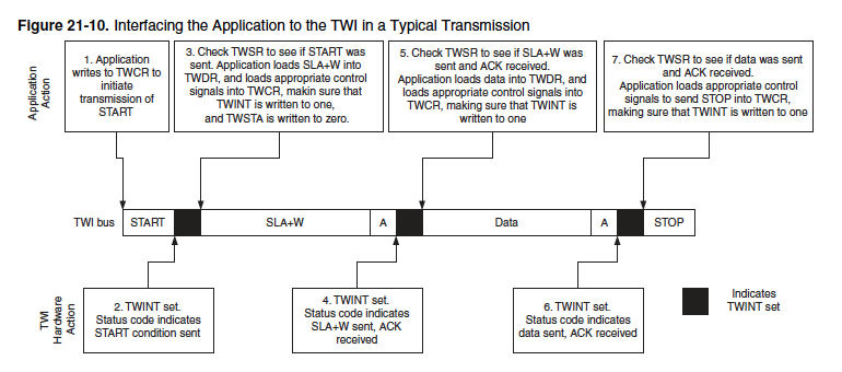 Referring to the Registers table above, the Reader's Digest version of an I2C write operation using the TWI hardware goes like this: