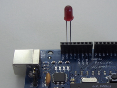 Os LEDs têm polaridade, isto é, eles apenas acendem se você orientar os seus terminais corretamente. O terminal mais longo é normalmente o positivo e que vai conectado ao pino 13. O terminal mais curto conecta-se ao GND; o bulbo do LED normalmente terá um pequeno chanfro achatado indicando esse terminal. Se o LED não acender, tente inverter os terminais (você não danificará o LED se ligá-lo invertido por curto período).