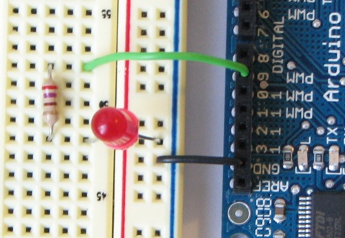 Um LED conectado ao pino 9 por meio de um resistor apropriado (aqui, 270 ohms)