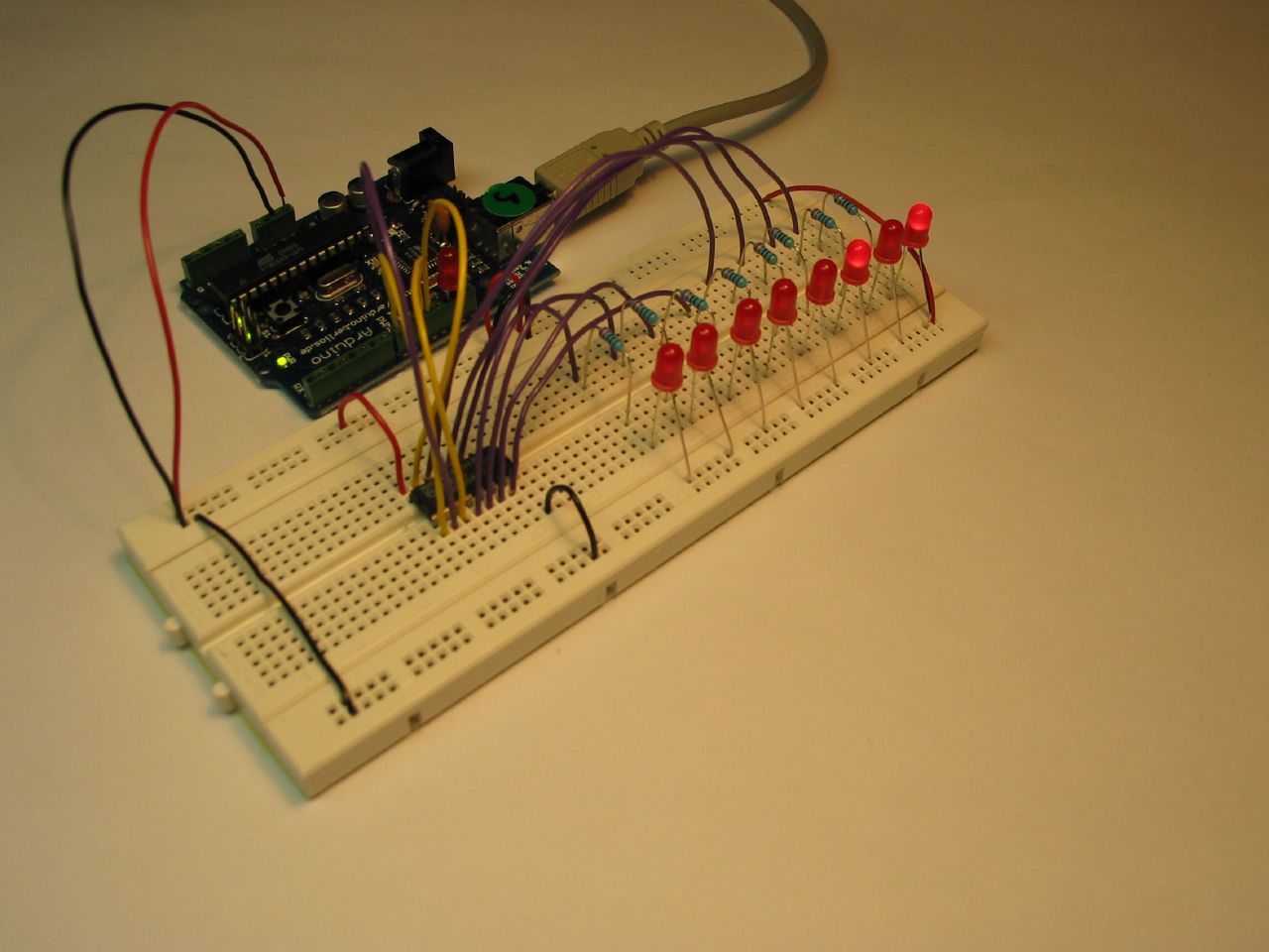 Este exemplo usa um driver de LEDs para controlar uma quantia quase sem fim de LEDs usando apenas 4 pinos do Arduino. Para isso, emprega-se o chip 4794 da Phillips. Encontre aqui mais informações sobre ele.