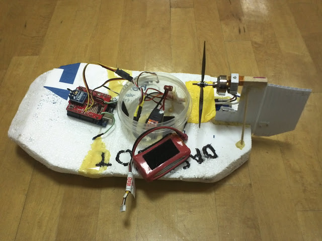 In order to use a hacked joystick, an Arduino and an XBee interface with my homemade rc airboat to control rudder and throttle.