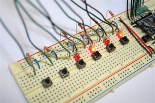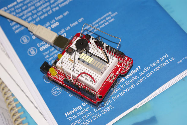 The Arduino Kitchen Timer is a simple timer based around a 10 bar LED Bar Graph, with a Piezo-Electric Buzzer. A line of 10 LED's could also be used, and each LED represents a segment of 5 mins. Once the Arduino is reset the user holds a pushbutton and the Bar Graph counts up in chunks of 5 mins, until the user lets go of the button. The timer then times 5 mins, and the last LED is turned off, etc until the timer is finished. The LED bar graph then shows a display, and a piezo buzzer sounds an alarm.