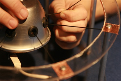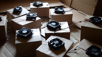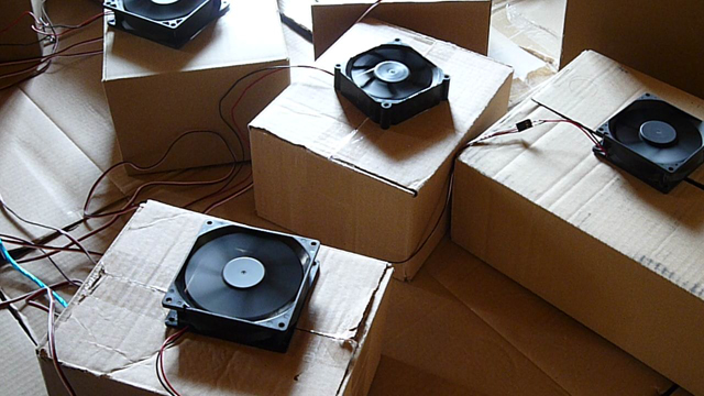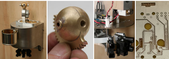 The sculpture is controlled by an Arduino Diecimila, sound is played through an Adafruit Wave Shield, and the motor is controlled by a custom board that was made using Eagle CAD.