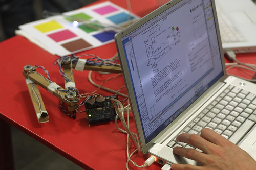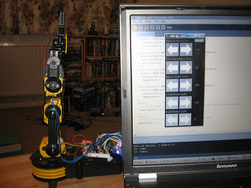 Very simple start to wiring in an Arduino to control a cheap robot arm kit and then controlling it using Processing. On going project to program a responsive robot arm.