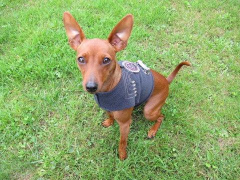 In this project i am sewing a Lilypad wearable Arduino board and five LEDs with conductive thread on my dog’s shirt. She (Ianto) is a Miniature Pinscher running very fast for fun. In curves fast enough for Persitence of Vision. And she likes running in large circles in the park! Light writing.